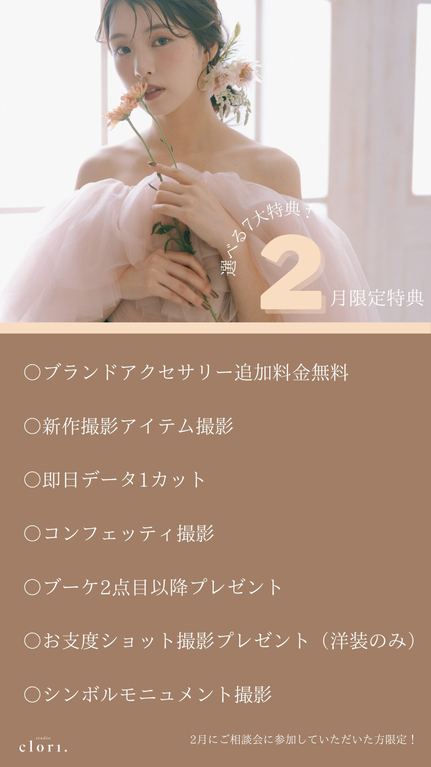 ・ウエディングフォト体感ができるスタジオ見学ツアー ・新作ドレスも実際に確認できるドレスショップ見学 ・様々なプランの中からお二人にぴったりなプランを提案できるプラン相談会 など